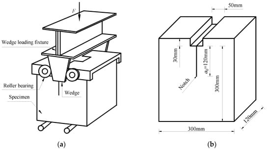 The notched wedge splitting specimens are employed for investigating concrete fracture properties. The advantages of using it are that its self-weight has an insignificant effect on test results and the ratio of ligament length to sample size is considerably large [26]. However, to avert the unexpected failure of the sample and improve the stability of the sample, the double supports were used instead of the traditional sample with one-line support [27]. The test principle is shown in Figure 1a, where the vertical load is converted into the horizontal splitting force through a wedge-loading fixture. In the present test, the wedge angle is 15°.