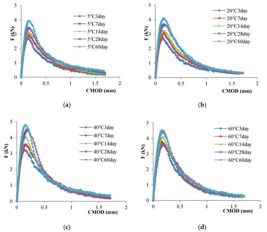 As presented in Figure 3, at the beginning of loading, there was a linear relationship between load and CMOD, indicating that concrete was in the stage of linear elasticity. The specimen did not undergo significant nonlinear deformation before the crack initiation or reaching the cracking load. For each curing condition, the initial slope increased as the concrete become older, which was attributed to the increase of the concrete strength and stiffness with time elapsing. Further, with the increase of curing time, the peak load grew markedly under each investigated curing temperature. For instance, for the specimens exposed to 5 °C, the peak load was 2.683 kN after 3 d, 2.906 kN after 7 d, 3.156 kN after 14 d, 3.427 kN after 28 d, and 3.911 kN after 60 d. The peak load increased by 14.1% from 28 d to 60 d, indicating that there was still a lot of un-hydrated cement inside the concrete under this curing condition. A similar phenomenon was also observed when the concrete kept at high temperature, but the rate of growth was lower than that of the concrete exposed to low temperature. Typically, for the concrete exposed to 60 °C, the peak load improved from 3.565 kN after 3 d of hydration to 4.491 kN after 60 d of hydration, where the peak load hardly increased beyond 28 d hydration.