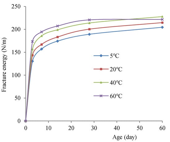 It can be seen from Figure 4 that the concrete fracture energy increased rapidly during the first 3 d, irrespective of the curing conditions investigated. Over time, fracture energy kept increasing at a reduced rate and gradually stabilized when the age was large enough. For instance, in the case of 5 °C, the fracture energy was 130.4 N∙m−1 after 3 d of hydration, 157.2 N∙m−1 after 7 d of hydration, 174.4 N∙m−1 after 14 d of hydration, 189.4 N∙m−1 after 28 d of hydration, and 204.7 N∙m−1 after 60 d of hydration. The value of fracture energy at 60 d was 8.1% greater than that at 28 d. It means that the fracture energy continuously improved with the increase of age and the growth rate was still relatively great. In other words, in the case of 5 °C, 60 d of curing time were not sufficient to make the concrete achieve the stable state and there was a lot of un-hydrated cement inside the concrete. A similar phenomenon was observed under elevated temperature, but the fracture energy tended to reach a plateau value in a shorter time. Typically, for 60 °C, fracture energy was 173.7 N∙m−1 after 3 d of hydration, 194.4 N∙m−1 after 7 d of hydration, 207.7 N∙m−1 after 14 d of hydration, 220.8 N∙m−1 after 28 d of hydration, and 221.7 N∙m−1 after 60 d of hydration. Obviously, in this case, the growth rate of fracture energy decreased significantly after 14 d and even stopped increasing after 28 d. At high curing temperature, the shorter stable time is mainly due to a higher temperature accelerating the hydration reaction rate of cement.