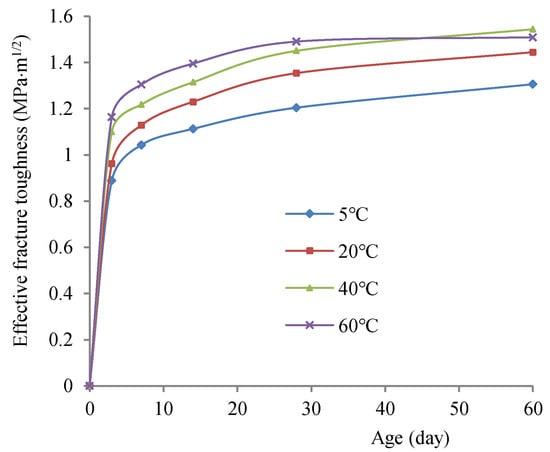 As can be presented in Figure 5, for each curing condition investigated, the effective fracture toughness was closely related to age and its value increased with age, which was the same as fracture energy with age. In the beginning, effective fracture toughness improved significantly with the growing age, because at this stage the reaction rate of cement hydration was quite fast. The growth rate increased by degrees and then reduced after maximizing. Subsequently, effective fracture toughness increased slightly with age at a reducing rate and finally reached a constant as the age was further extended. Typically, for 5 °C, the effective fracture toughness continuously increased from 0.889 MPam0.5 after 3 d of hydration to 1.043 MPam0.5 after 7 d of hydration, 1.113 MPam0.5 after 14 d of hydration, 1.204 MPam0.5 after 28 d of hydration, and finally 1.306 MPam0.5 after 60 d of hydration, with a significant increase of 0.417 MPam0.5 or 46.9%. Similarly, for 60 °C, the effective fracture toughness was 1.164 MPam0.5 at the age of 3 d, 1.304 MPam0.5 at the age of 7 d, 1.395 MPam0.5 at the age of 14 d, 1.490 MPam0.5 at the age of 28 d, and 1.509 MPam0.5 at the age of 60 d. The fracture toughness at the age of 60 d was only 1.3% greater than that at the age of 28 d. This also demonstrated that it takes a shorter time for the effective fracture toughness to reach the constant value under higher temperatures.