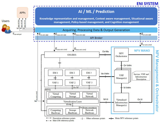 - ETSI GS ENI 005 (V1.1.1): Experiential Networked Intelligence (ENI). System Architecture. 2020. Available online: https://www.etsi.org/deliver/etsi_gs/ENI/001_099/005/01.01.01_60/gs_ENI005v010101p.pdf (accessed on 8 July 2020).