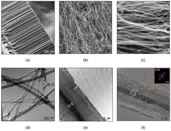 Cross-sectional scanning electron microscopy (SEM) images of the radially-oriented aligned multi-walled carbon nanotubes (MWCNTs) (a), the initial MWCNTs after grinding in a rotary-type disperser (b,c). The transmission electron microscopy (TEM) image of MWCNTs (d) and high-resolution transmission electron microscopy (HRTEM) images of an iron catalyst (γ-Fe)-filled nanotube (e,f). The MWCNT dimensions and carbon interplanar spacing 3.39 Å are marked in (e). The (f) image shows the fast Fourier transform insert, that indicates the crystallinity of the filling (γ-Fe interplanar spacing 0.207 nm).