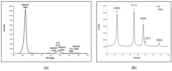The X-ray powder diffraction patterns of (a) the initial MWCNTs and (b) as-prepared composite material sample MWCNTs coated with pyrolytic tungsten carbide with initial MWCNTs/W(CO)6 ratio of 1:3 (sample 1).