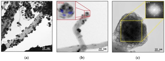 MWCNTs and hybrid materials synthesized for the current study were characterized using a number of chemical and physical analysis methods. XRD, TEM, SEM and the energy-dispersive X-ray spectroscopy (EDS) were conducted using equipment of Center “Physics and technology of micro- and nanostructures” at The Institute for Physics of Microstructures of RAS, and Raman Spectroscopy—using equipment of the Centre of Collective Use at the Institute of Geology of Komi Science Centre of the Ural Branch of RAS. All samples were studied by NEXAFS spectroscopy using synchrotron radiation from RGBL at BESSY II Storage Ring (Berlin, Germany) [44,45]. XPS studies were carried out using the equipment of the resource center of the Science Park of St. Petersburg State University “Physical methods for surface research”. The features of experimental studies and the characteristics of used equipment are described in more detail in [42].