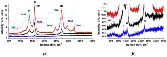 Figure 5 shows the Raman spectra of the initial MWCNTs and nanocomposites (samples 2 and 3). The WC/MWCNT spectra in Figure 5 contain all the characteristic peaks of the initial nanotube. Since their ratios ID/IG are close to 0.5, one can make the conclusion that the metal deposition does not destroy the nanotube structure. The intensities of D and G peaks in the Raman spectrum are greatly reduced for sample 2 and become very small for sample 3 compared with those for the initial MWCNTs. These noticeable changes are due to the strong absorption of the incident, scattered by the nanotube laser radiation by a pyrolytic tungsten carbide coating layer and the uncoated nanotube surface area decrease. The penetration depth of the exciting laser light into the WC and WC1-x coating could roughly be estimated to a 30–80 nm [48,49,50]. In doing so, the penetration depth into the amorphous and crystalline WO3 films is very high, because all the films are transparent above λ = 400 nm [51]. Therefore, the strong suppression of the MWCNT surface Raman modes is caused only in the pyrolytic tungsten carbide layer. From previously published works [52,53,54,55,56,57,58,59,60,61,62], it is known that crystalline WO3 corresponds to the Raman peaks at 275, 880 and 945 cm−1. However, this structure is not observed in the Raman spectra of the studied samples. It can be seen from Figure 5b that in the region 600–1000 cm−1, some broad peaks are visible and can be created by tungsten carbide or oxide phases. The strong broadening of this band suggests that the formed compounds present a high structural disorder, indicating low crystallinity [60,61,62]. The presence of the band in the Raman spectra is characteristic of WC1-x nanoscale crystallites and its appearance in the spectra of samples 2 and 3 is probably associated with a nanocomposite structure formed by WC1-x nanocrystals [55,60,63,64], which is consistent with diffraction analysis.