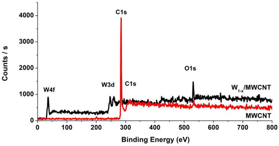 Figure 8 shows the XPS survey spectrum of the initial MWCNTs and WC1-x/MWCNT nanocomposite (sample 2). Figure 9a–c shows their photoelectron spectra in the C1, O1 and W4f regions, respectively. The photoelectron spectra of the initial MWCNTs are in good agreement in the peaks number, their energy positions and half-widths with the nanotubes XPS spectra from [73,74,75,76,77]. The MWCNT C1 spectrum consists of an intense asymmetric peak A (284.5 eV) with a smooth tail from the short-wave side (its binding energy corresponds to one of C1’s electrons in the nanotubes graphene layers) and a wide P band with an energy of 291.0 eV due to additional excitation of π plasmon. It is significant that in the MWCNT XPS C1 spectrum (Figure 9a) there are no separate peaks related to carbon oxides, but in the survey spectrum in Figure 8 there is a low-intensity O1 peak in the 532 eV region, which indicates the presence of oxides on the initial nanotube surface. This band, as can be seen in Figure 9b, consists of two peaks B (531.6 eV) and C (533.4 eV), which are associated with transitions in the OH- [78] group and H2O [79] water molecule adsorbed on the nanotube surface upon their transfer to the atmosphere. The effect of these compounds on the states of carbon atoms on the nanotube outer surface is probably the reason for the appearance of a wide absorption band of 286–289 eV (Figure 7a) in the NEXAFS C1 absorption spectra of the initial MWCNTs. The percentage of oxygen atoms in the initial MWCNTs was determined by using the Thermo Avantage software package from comparing the integrated peak intensities in the C1 and O1 spectra of the MWCNT and equals to 2.3%. This result refines the data from EDS and NEXAFS spectroscopy. The initial MWCNT XPS spectra analysis demonstrates their high purity degree.