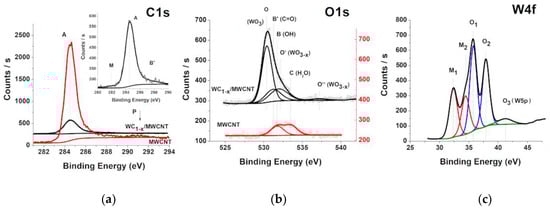 For the WC1-x/MWCNT composite, the XPS signals of Tungsten 4f and 3d (centered at ~35 eV and ~245 eV), C1s (~285.0 eV) and O1s (~532 eV) were detected (Figure 8). A comparison of the XPS C1 spectra of the initial nanotubes and the WC1-x/MWCNT composite (Figure 9a) shows a strong decrease in intensity and an increase in half-width by 0.33 eV of the composite main peak A (284.5 eV), corresponding to the bond between carbon atoms in graphene layers. Moreover, there are two additional low-intensity details M (282.9 eV) and B′ (287.5 eV) in the WC1-x/MWCNT spectrum. The energy position of the peak M corresponds to the C1 binding energy in tungsten carbides [80,81,82]. Therefore, its appearance is associated with transitions in carbon atoms of the WC1-x coating layer. The weak peak energy B′ corresponds to the binding energy of the C1 electron in the C=O group [83,84], the presence of which in the nanocomposite is confirmed by NEXAFS spectroscopy data (Figure 7a).