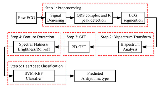The block diagram of the proposed method for ECG beat classification is depicted in Figure 1. The procedure is divided into five steps: (1) ECG signal pre-processing, (2) bispectrum analysis, (3) 2D-GFT, (4) feature extraction and (5) classification by the SVM-RBF.