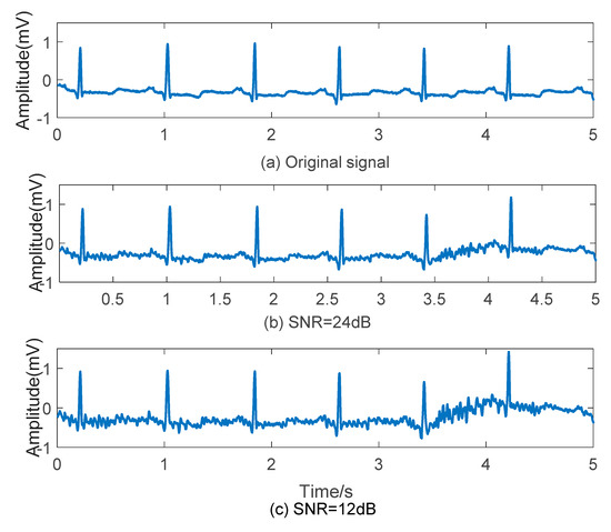 Effect of EMG noise on ECG signal. (a) Original signal; (b) ECG signal with EMG noise (SNR = 24 dB); (c) ECG signal with EMG noise (SNR = 12 dB).