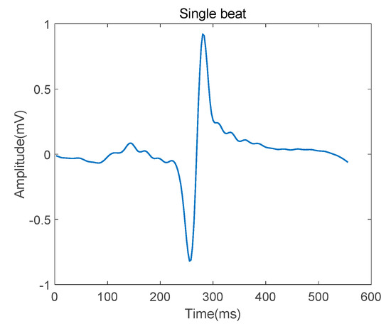 In the preprocessing stage, we used four steps to reduce noise. First, the DC component is eliminated by subtracting the average value. Then, the baseline drift is reduced with a median filter. The low-pass filter is used to remove power frequency interference and electromyogram (EMG) noise. Finally, the high-pass filter can eliminate some other low-frequency noise. After denoising, the R peak points are subsequently detected. The single heartbeat data are configured by segmenting the signal to be centered on the R peak point.