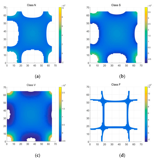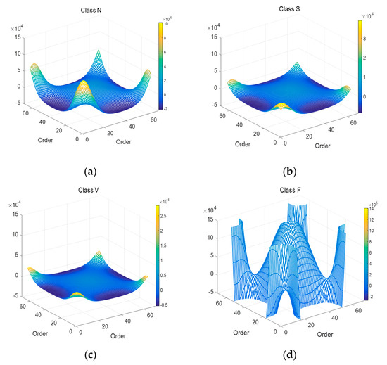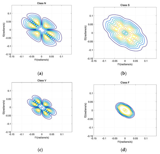 Set the length of every segment as 128 and 50% as the overlapping rate. Figure 5 shows the bispectrum contour plots of the four types (N, S, V, and F beats) of ECG signals (from recordings No. 100, 232, 208 and 213).