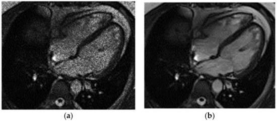 Heart MRI: (a) image with white noise and (b) denoised image.