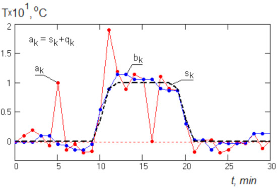 In Figure 3, an example of applying median filtering to a model signal ak is shown. It is composed of a deterministic signal sk and a random signal qk having a normal distribution with single pulse surges δ(t) of short duration.