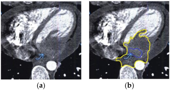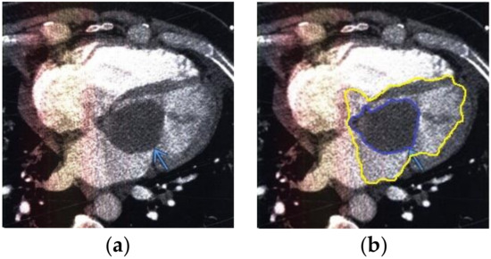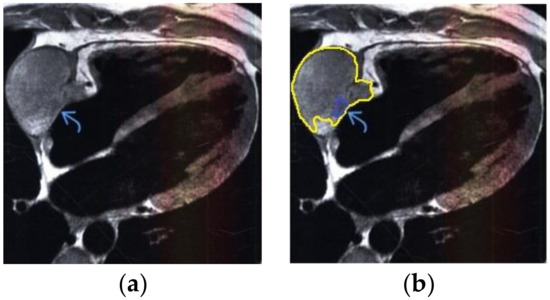 Heart MRI: (a) image with white noise and (b) denoised image with contrast enhancement of volume melanoma in the left atrium.