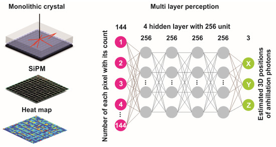 MLP was implemented as a DNN model for a prediction of the scintillation position within the monolithic crystal (Figure 1). To select appropriate hidden layers/units, we varied the number manually and determined the best combination. Lastly, 4 hidden layers and 256 hidden units were carefully chosen based on the minimum position resolution. In the training phase, data of approximately 5 × 106 scintillation points—including the number of SiPM pixels (from 1 to 144) activated by scintillation photons, the weight of each pixel (the total number of optical photons absorbed by a certain pixel) and the accurate 3D position of the scintillation point within the crystal’s volume—were determined through MC simulations as reference. The DNN model was trained to synthesize the 3D position of the scintillation event from the map of optical photon distribution. For this work, a rectified linear unit (ReLU) was used as an activation function and the 144 SiPM’s pixel weights were converted into 4 hidden layers and 256 units. The number of epochs was set to 150 and Adam’s optimizer, with a weight decay of 10−4, was implemented for regularization and optimization purposes.