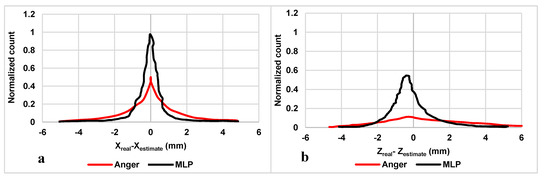 Figure 3a shows histograms in the XY plane of the estimation error Xreal-Xestimate whereas Figure 3b illustrates histograms of the Z-axis (DOI) estimation error Zreal-Zestimate from the validation dataset. On the XY plane, the histograms obtained using the MLP approach are almost similar to those obtained using Anger logic. In contrast, along the Z-axis, the MLP histogram is more symmetric in pick neighborhoods (still asymmetric in tails), different from the Anger histogram, depicting a visible difference between the proposed and conventional method.