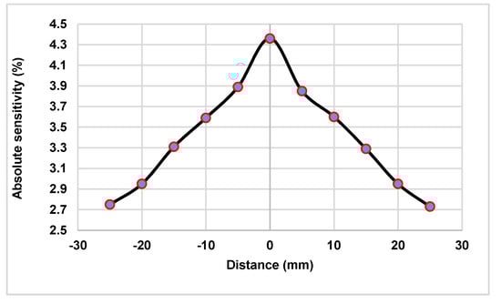 Absolute sensitivity measured at different distances from the center of the field-of-view (FOV) along the Z-axis for the simulated PET scanner.