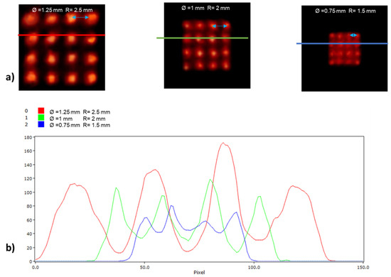 (a) Planar images and (b) line profiles of a grid containing 16 spherical sources with different diameters (from left to right: 1.25, 1 and 0.75 mm) and distances (from left to right: 2.5, 2, and 1.5 mm) for detector modules using the MLP positioning algorithm.