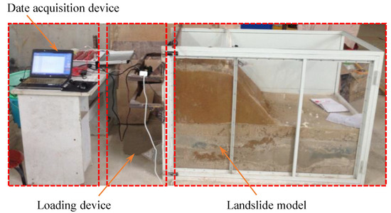 The testing system consists of three parts, i.e., the data acquisition device, the frame of the landslide model and the loading device. The horizontal load is applied by a jack. The displacement of the pile head and the force in the stabilizing pile under different conditions are monitored. The layout of the test model is shown in Figure 1, and the frame diagram is shown in Figure 2. The testing device contains the sliding body, the loading device, the sliding bed, the stabilizing pile, and the monitoring equipment.