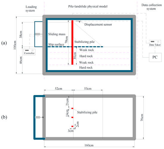 Functional block diagram of the pile–landslide physical model: (a) side view (b) top view.