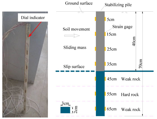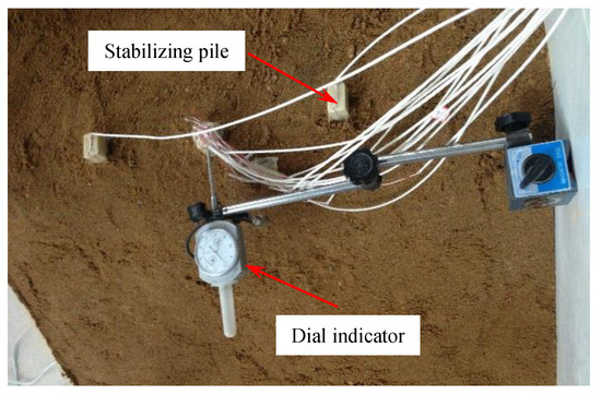 To minimize the boundary effects on the test results, three stabilizing piles were used in the model, and the top displacement of the middle pile was measured through the dial indicator. The arrangement of the stabilizing pile and the dial indicator is shown in Figure 4.