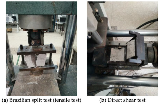 To produce the artificial soft rock, hard rock and sliding body similar to those in the field, a series of experiments were carried out. The soft and hard rock samples, with dimensions of 7 cm × 7 cm × 7 cm, were cured for 30 days, and the material and strength parameters of the samples were obtained by conducting the tensile test and the direct shear test (Figure 5). Based on the field parameters, the proportion of the materials was adjusted to the obtained optimum ratio. The standard ratio of the sand to clay is 1:1 for the sliding body, the hard rock was produced from sand, cement, gypsum, and water with the proportion of 3:1:1:1, and the soft rock was produced with sand, cement, gypsum, and water according to the proportion of 9:1:1:2. Nylon rods made of polyethylene were used to produce the piles. The raw materials of the model are shown in Figure 6, and their physical and mechanical parameters are presented in Table 3.
