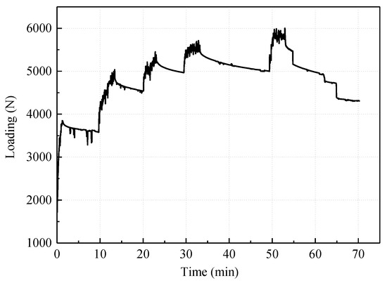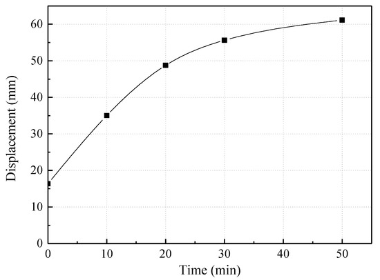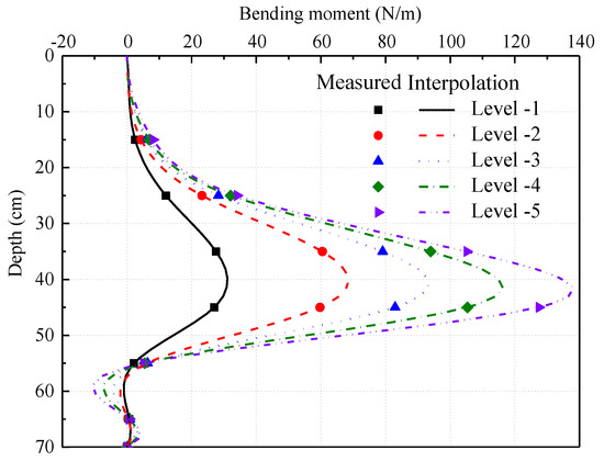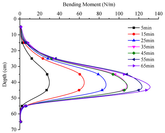 The experiment was divided into five loading stages, starting at times 0, 10, 20, 30, and 50 min. The load remains constant for 10 min in the first, second and third stages, and given it is gradually difficult to apply load with the load increasing and the applied load is instable, the interval time is approximately set to 20 min in the fourth stage [41,44]. By monitoring the strain along the length of the pile, the bending moment can be determined using Equation (1), see Figure 7.