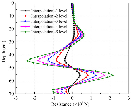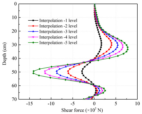 Using the cubic spline curve interpolation method, the distribution of the bending moment along the length of the pile was obtained for different loading stages (Figure 10). Based on the bending moment equation M(x), the shear force distribution Q(x) can be calculated from the first-order derivative of M(x) (Figure 11), and the soil resistance distribution function can be obtained from the second-order derivative (Figure 12).