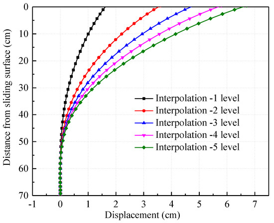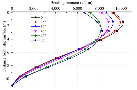To rigorously study the influence of the dip angle of soft and hard interbedded bedrock layer on the displacement and internal force of the embedded section of the stabilizing pile, 16 numerical simulations are performed with the layered bedrock dip angle increasing by 5° from 0° to 75°. Since the trends of the curves were consistent, to clearly display the trends, 6 typical curves were selected to plot. These simulation results are shown in Figure 20, Figure 21 and Figure 22.