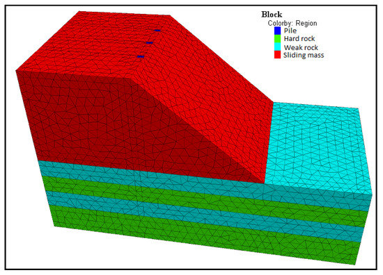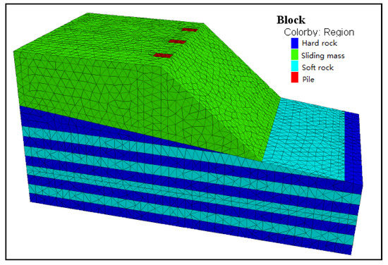 The sliding bed simulated is a composite layered rock mass with discontinuities. The discrete element method, suitable for the simulation of discontinuous media, is used for the three-dimensional numerical modeling of piles and rock. The numerical model is established using 3DEC with the same dimensions as the test model (Figure 14). The ideal elastoplastic model (cons = 2) was selected as the constitutive model of the rock and soil. The Mohr–Coulomb Failure Criterion was chosen as the failure criterion of the rock and soil, and the Coulomb sliding failure model (jcons = 1) was used as the rock structure plane constitutive model. The boundary conditions of the model include horizontal constraints imposed by the horizontal and vertical sides, fixed constraints imposed by the bottom boundary plane of the model, and an unrestrained upper boundary surface. The rear edge of the sliding body applies a leftward (negative x-axis) uniform distribution of horizontal load to the upper part of the stabilizing pile.