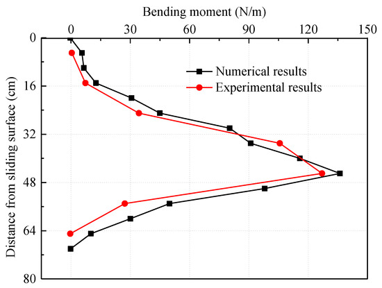 According to the pressure loading method shown in Figure 8, the mechanical parameters are the same as Table 3. The bending moment distribution for the middle stabilizing pile is shown in Figure 15. It is observed that the numerical results are in good agreement with the experimental test results, indicating the reliability of the model.