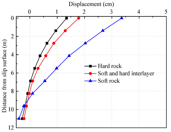The distributions of lateral displacements along the stabilizing pile embedded in different bedrocks, i.e., a homogeneous soft rock, a soft and hard rock interlayered and a homogeneous hard rock, are shown in Figure 17. The existence of the soft bedrock layer makes the displacement of the stabilizing pile larger but less than that of the homogeneous soft rock. When the sliding bed is a homogeneous hard rock, the displacement of the stabilizing pile at depth of 9 m is equal to 0, indicating that the embedded section of the stabilizing pile is too long. However, the larger embedment length in the interlayered and homogeneous mudstone is indeed more appropriate, illustrating that the reasonable embedded length of the stabilizing piles are affected by the heterogeneity of the landslide rock mass.