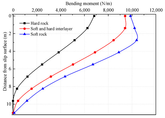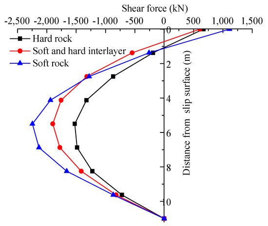 From Figure 18, it can be seen that the existence of the bedrock layer and the combination of soft and hard interlayers, results in the increase of the bending moment and shear force along the stabilizing pile, but the increase is less than that of the homogeneous soft rock. As the rock becomes softer, the bending moment and the maximum shearing force of the stabilizing piles gradually increase, and the position of the maximum bending moment point of the bending moment diagram gradually moves downward.