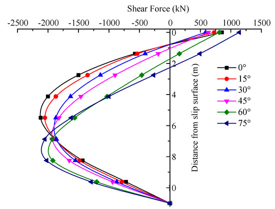 From Figure 21, as the dip angle of the soft and hard interbedded bedrock layer increases, the maximum value of the bending moment gradually decreases, and the position of the maximum moment point on the bending moment curve gradually moves downward. Above 4 m, the bending moment gradually decreases as the dip angle increases; however, under 4 m, the bending moment value gradually increases as the dip angle increases. From the shear force diagram, it is observed that as the dip angle increases, the point where the shear force is zero gradually moves downward, while the maximum shear force initially decreases and then increases. When the dip angle is less than or equal to 45°, the position of the maximum shear point remains unchanged, while the position of the maximum shear point moves downward when the dip angle is greater than 45°.