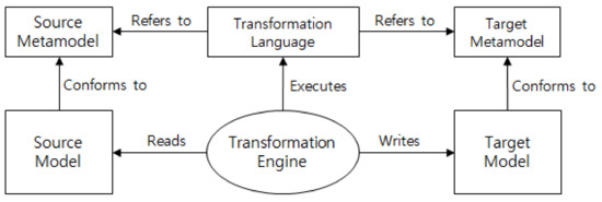 The detailed process is shown in Figure 1. The source model depicts the model before transformation, and the source metamodel contains meta-information on the source model. The target model is the model after transformation, and the target metamodel contains meta-information on the target model. Transformation language automatically converts a source model to a target model using meta-information from the source metamodel and target metamodel. The transformation engine parses and executes transformation language to transform the source model into a target model.