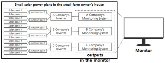 The structure of a legacy monitoring system is shown in Figure 2. Generally, inverter companies provide monitoring systems. Therefore, if heterogeneous inverters are installed in one power plant, one monitor should be used to run heterogeneous monitoring systems.