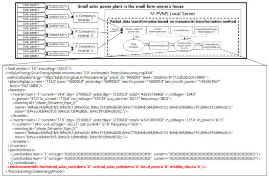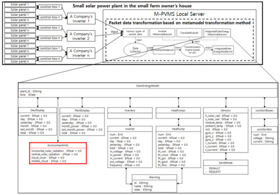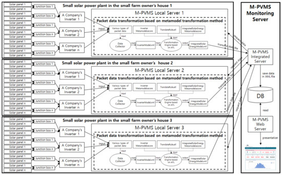 Our M-PVMS for small farm owners manages information from heterogeneous inverters, such as the power amount, temperature, and tilt sensors. The M-PVMS consists of the local monitoring server and the integrated monitoring server, as shown in Figure 3. The local monitoring server sends the integrated monitoring server the monitoring data generated in junction boxes and inverters using RS232 communication. The problem is that different inverter manufacturers use different data protocol formats. To solve this problem, the local monitoring servers convert data generated in heterogeneous inverters into integrated data with the metamodel-based model transformation. The integrated monitoring server collects the data received from the local monitoring servers using TCP/IP communication to manage all data, which are stored in a database and analyzed through big data systems. They exist for services such as target load prediction, real-time prediction of new renewable energy, integrated control, optimal control status, and operational integration monitoring.