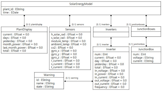 Figure 4 shows the structure of the metamodel used to convert data generated in heterogeneous inverters into integrated data. Each local monitoring server automatically performs the function to convert heterogeneous inverter data formats in accordance with metamodel structures, which is composed of a root element called the SolarEnergyModel. It contains the system ID and time of the transmitted protocol where there exist subnodes, such as PlantDisplay, Inverters, Sensors, and Junction Boxes. The PlantDisplay node exhibits total monitoring results, such as current power, daytime power, yesterday’s power, monthly power, last month’s power, and total power. Inverter nodes combine the information collected by each inverter node, which comprises data such as current power, day power, yesterday’s power, total power, output current, output voltage, input power, input current, input voltage, frequency, and warning data. The sensors node consists of some data, such as horizontal solar radiation, gradient solar radiation, module temperature, ambient temperature, CO2 density, slope, etc. The JunctionBox node shows the voltage and current values of the PV modules connected to the real junction box.