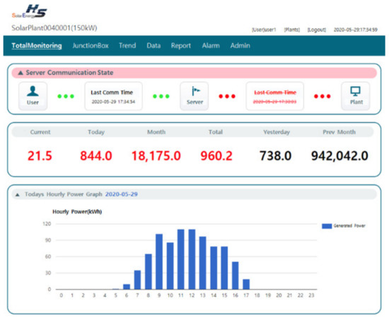Our M-PVMS monitoring system is shown in Figure 5. The current and past amounts of power generations can be collected from the real-time monitoring on the webpage.