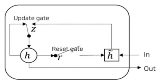 The GRU algorithm [18] is a structured cell that lowers the computational complexity of LSTM, which is an improvement of the existing RNN structure. It has the advantages of an LSTM cell; however, it can reduce the number of gates used previously and speed up learning by not using additional nonlinear functions when calculating the output values. GRU gates are approximately divided into an update gate and a reset gate. Input and forget gates of LSTM are merged into the update gate, and the reset gate is applied to the previous hidden state value. Figure 7 shows the structure of the GRU cell.