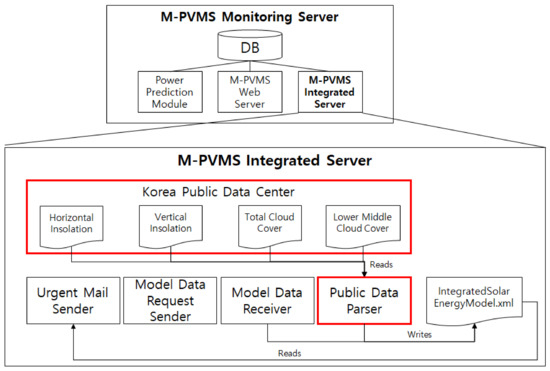 We add a public data parser into the M-PVMS integrated server in the red box at Figure 8. The public data parser gets horizontal and vertical insolation, total cloud cover, lower-middle cloud cover from the Korea public data center [19], and saves into the IntegratedEnergyModel.xml file after parsing them.