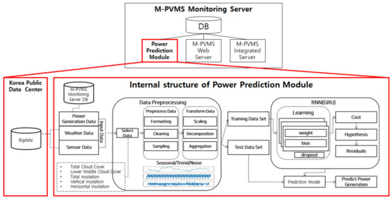 This paper is organized as follows. Section 2 describes related studies. Section 3 describes how to improve the M-PVMS integrated server with redefining the metamodel for prediction of M-PVMS power generation. Section 4 describes the accumulated data analysis within the M-PVMS system, the data identification for training data set, and power prediction module of power generation with the GRU algorithm. Section 5 describes the verification of our predication model. Finally, Section 6 presents the conclusion and future work.
