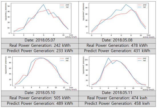 Figure 12 shows the graphs that predict data for 12 h when the sun was passing by predicting the amount of power generation per hour. Figure 13 shows results for 105 days obtained by predicting data per day. The red line represents the prediction and the blue one indicates the real power generation value. Consequently, there is little difference between the predicted total power generation and the real total power generation from 0.01% to 0.02%.