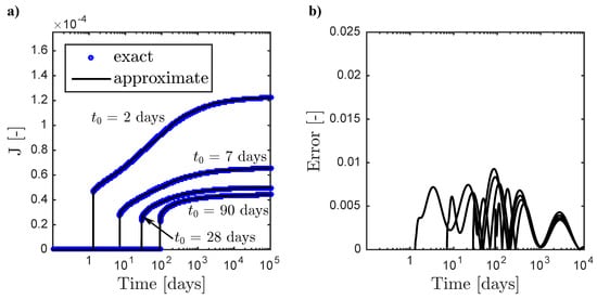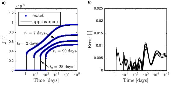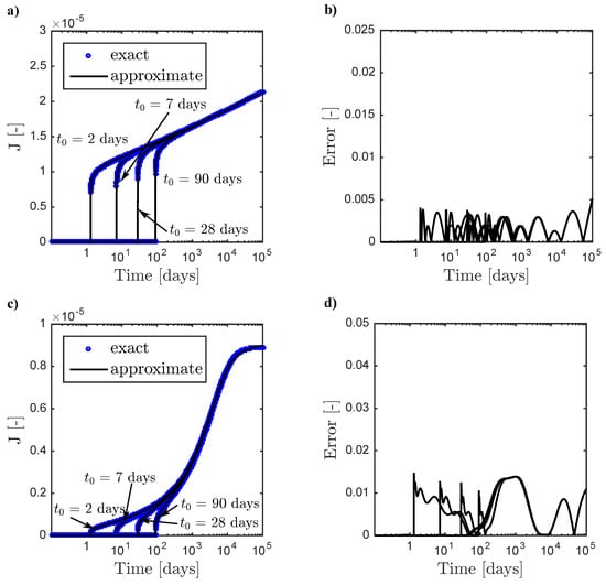 with (from Equation (35)) for days. The quality of the approximation of the B3 compliance function by Dirichlet series with the coefficient obtained from Equation (58) is shown in Figure 3a for different and with . The approximated curves exhibit a maximum error, plotted in Figure 3b, below 1% with the adjustment factors for and . For the numerical calculation of the basic creep function of the B3 model, in Equation (56), reference must be made to the solidification theory [22,34] for which the visco-elastic strain rate is given by
