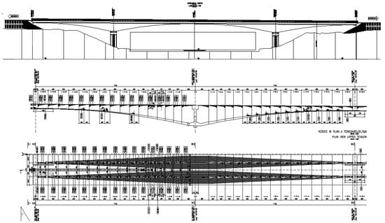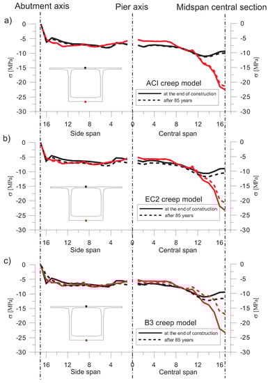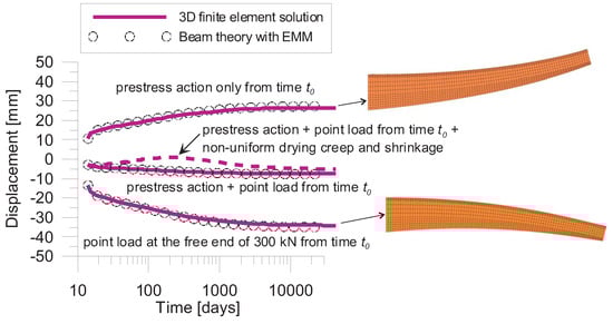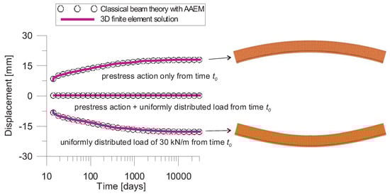 In order to validate the proposed finite element formulation, two examples are considered, a prestressed simply supported beam and a prestressed cantilever box girder, for which the results of the 3D finite element analyses are compared with the one-dimensional calculations. Then the long-term behavior of a real bridge of “balanced cantilever girder” type, characterized by a central 155 m span, with two side symmetric 77.5 m spans, has been analyzed (and has been the motivation of this work). The bridge belongs to the new Medgidia-Constanta Motorway crossing a wide artificial channel that connects the Danube River to the port of Constanta in the Black Sea. It holds the record span-length in Romania for prestressed concrete deck type and has required for its construction concrete volumes of 14,700 m for foundations and 7700 m for piers and decks, total reinforcing steel weight of 2600 t, and total post-tensioning tendons weight of 390 t. For this bridge, the predictions of the various creep formulations in terms of deflections, prestress loss and stress state in the upper and lower slabs of the cross section are compared.