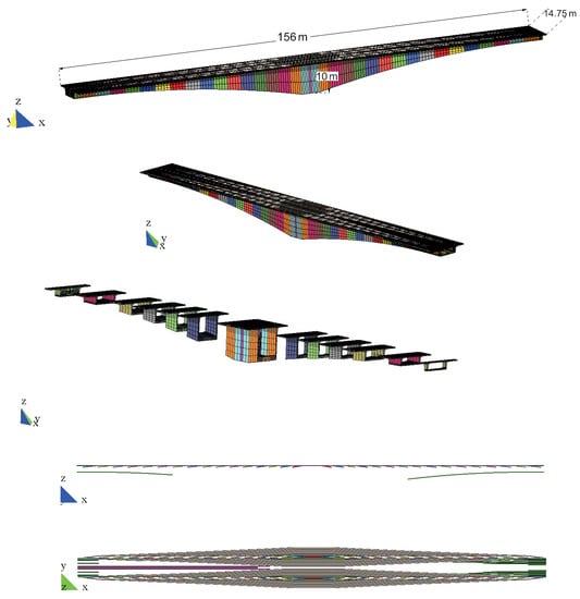 The procedure has then been implemented in a three-dimensional finite element model for bridge design, capable of taking into account both the different shrinkage and drying creep properties of the various parts of the bridge cross-section and the shear lag effect, both of which cannot be captured by the classical beam theory commonly used in bridge design. In particular the shear lag effect influences drastically the accuracy of the calculation of the prestress loss and of the bridge deflection. As reported in [12,13] the shear lag occurs in different ways: In the transmission of vertical shear force due to vertical reaction at the pier and in the transmission of the concentrated forces of tendon anchors into the horizontal slabs and the vertical walls of the box.