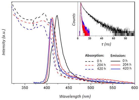 - Anni, M.; Cretì, A.; Zhang, Y.; De Giorgi, M.L.; Lomascolo, M. Investigation of the role of the environment on the photoluminescence and the exciton relaxation of CsPbBr3 nanocrystals thin films. Appl. Sci. 2020, 10, 2148. [Google Scholar] [CrossRef]