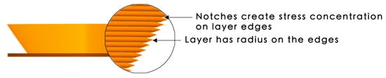 ME is useful to produce quick and low-cost prototyping with great freedom of scalability where parts can be printed in different geometries, quantities and sizes quickly []. However, ME is less suitable for producing intricate or miniaturized parts due to the circular profile of the print nozzle where the minimum nozzle size is 0.2 mm. As a result, corners and edges will have a radius that is equal to the size of the machine nozzle. Layers from the ME process are printed as a round-ended rectangle, in which the joints and seams between each layer are often visible as small valleys (Figure 2). These visible layers sometimes result in a stair-stepped effect and post-processing is required to achieve a smooth surface. Unlike the material properties achieved through subtractive or formative manufacturing, most ME parts are inherently anisotropic and not fully dense due to the nature of the layer-by-layer fusing of material. The bond and strength of the printed part are usually weaker along the plane of the layer interface []. ME parts may also encounter an issue with repeatability due to differential printer characteristics or inconsistency in printing conditions such as cooling or warping [].