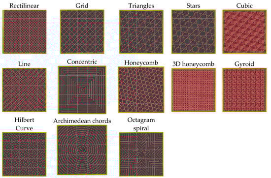 The right percentage of infill reduces the amount of print time and material usage, but this needs to be balanced with the overall strength of the part that is required. The infill pattern and infill density influence the mechanical performance of printed parts. In general, the mechanical performance of the printed part reduces when the infill density is lower. Slicing software such as Slic3r PE by Prusa Research offers end-users with up to 13 types of infill patterns as shown in Figure 3. The infill density can be set between a value of 0% and 100%, with 0% being hollow and 100% as being completely solid.