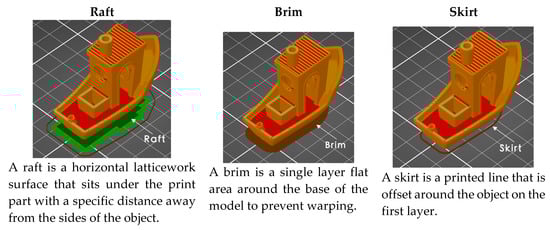 A key factor that can help improve the print quality of ME parts is to implement features such as raft, brim and skirt (Figure 4). The use of rafts and brims help to stabilize the printed part with a small surface area or footprint to improve adhesion and to reduce warping and delamination. A raft is made up of a predetermined layer of material with an adjustable infill percentage. It is first printed with a specific layer depth and with an optimal separation distance between the sitting model to aid part removal when the object cools. It can also be used to compensate for small inaccuracies in the build platform or for warped bed surfaces, scratches or dents []. The disadvantage of using a raft is that the model may be difficult to remove if the settings are not properly chosen. The lower layers may also have a different finishing result as compared to parts produced from printing directly onto the platform. A raft also consumes slightly more material and thus generates additional waste. As a result, the brim feature is often preferred []. A skirt consists of several layers of an outline that is offset away from the model. It is mainly used to ready or prime the extruder, and to also enable a final check for bed levelling issues and the quality of the filament being extruded before the print process commences. A brim feature is similar to a skirt, but it has a connected offset that is outward from the perimeter of the model. The brim can be used to prime the extruder as well as to enlarge the bottom surface area and hold down the edges of the model to improve the build platform adhesion. In the case of warping, the corners of the model are less likely to curl up or deform because the brim is attached to it. This is particularly useful when using materials that have a large shrinkage factor such as ABS or with semi crystalline polymers (e.g., PA12). The brim width is determined by the number of skirts that are built around the model [].